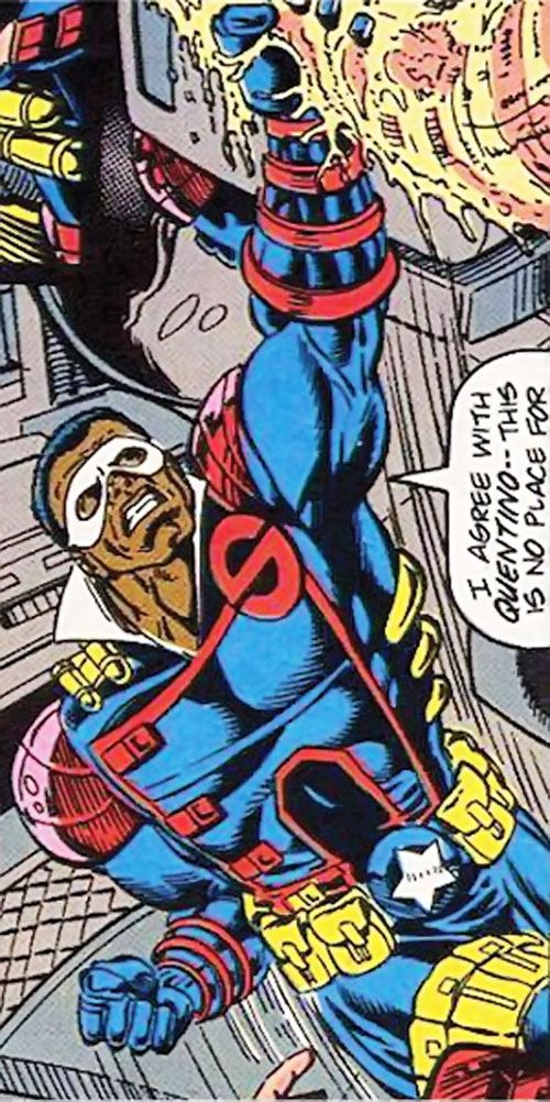 starting with the avengers team- Background Real Name: Lemar Hoskins. Marital Status: Single. Known Relatives: Leon (brother). Group Affiliation: Silver Sable International aka the Wild Pack ; former member of the Bold Urban Commandos (Buckies), former partner of Captain America VI, former agent for the Commission on Superhuman Activities, former member of the Anti-Registration Underground. Base Of Operations: Symkaria. At various times Chicago, Washington D.C. and Fort Meade (Maryland). Height: 6’6” Weight: 285 lbs. Eyes: Brown Hair: Black Powers and Abilities As Battlestar, Hoskins is still super-strong, super-durable and very fast. He also wields an Adamantium -reinforced shield. He’s much more experienced and clear-headed than he was as Bucky. He greatly improved as an operative, a fighter and a leader. He’s a solid professional. Battlestar (Marvel Comics) charging with his shield Battlestar usually fights in melee, since few weapons can hit as hard as he does. However, if the assignment requires weaponry — for instance sonic pistols to go against Venom — he’s well-trained to use those. Advertisement History Hoskins switched to the Battlestar name and costume, and finished training with the shield he had recently been allowed to use. By that point the government thought that Captain America (John Walker) and Battlestar had enough field experience to be trotted out for a public appearance. As it turned out, it was a disaster. Their former friends Lennox and Johnson, as Left-Winger and Right-Winger, attacked Walker and Hoskins in front of a crowded stadium. They had the time to reveal Walker’s name in front of the public, but not Hoskins’s, before they were defeated. Battlestar (Marvel Comics) and the Commission on Superhuman Activities Captain America and Battlestar continued to be one of the main two superhuman teams the government could field, the other being the Freedom Force. They were more like enforcers or soldiers than heroes, but while this fact distressed Walker, Hoskins didn’t really care. Among other missions they apparently killed Professor Power, arrested various mutants for resisting registration, and only narrowly survived a clash with the Resistants. Terror against terror Walker and Hoskins later were caught in the Viper’s deadly master plan. She mutated much of the Washington D.C. population into serpent people – including President Reagan. During this crisis, Battlestar ended up fighting Cap’s ally, Demolition Man. He won without realising that the much stronger D-Man was hindered by severe poisoning. Several weeks later, Hoskins earned another victory – he obtained his high school diploma. The consequences of Johnson and Lennox revealing Walker’s name eventually struck home. The Watchdogs captured Walker’s parents. Hoskins covered for his buddy when he left to rescue his parents, but the situation went south fast. The elderly Walkers were murdered, and a demoralised Captain America was captured by Flag-Smasher. Battlestar was sent to request the original Captain America’s help, and the two men fought ULTIMATUM forces to free Walker. In the wake of this case, the Commission was revealed to have been manipulated by the Red Skull all along. De-Commissioned Crushed, Walker resigned. He also stonewalled his friend Lemar, who wanted to help. Walker then appeared to be gunned down by a Watchdog. Lemar investigated, discovered that John’s casket was empty, and then resigned too. He told Dr. Valerie Cooper that he would do community service work in Chicago. What he actually did was continue to investigate Walker’s bogus death. Battlestar’s car (Marvel Comics) (Captain America) Hoskins determined that Walker’s sister and her family had vanished, that the assassin wasn’t a Watchdog, and that the ambulance company that had picked Walker up after he was shot was a fake. Hoskins confronted Dr. Cooper about that, but she just told him that if Walker wanted to contact him he would. Feeling that something was fishy, Battlestar continued to investigate – but he was reaching the limit of his skills. He decided to improve as a hero by training with a well-established hero, preferably somebody who knew Captain America. Given these criteria, the Falcon naturally came to mind, since his identity and location were public knowledge. When Battlestar came to meet him, he ran into three Serpent Society operatives trying to steal the Falcon’s flight harness. Lemar helped vanquishing them. Presumably, the Falcon then took Battlestar under his wing for some weeks or months to help him become a better hero. The investigation ends Battlestar eventually recognised USAgent, a new member of the West Coast Avengers, as John Walker. After doing surveillance on the Avengers Compound, he managed to attract his attention and confront him. While Hoskins was certain that USAgent was Walker, the man — whose face was looking different than Walker’s — angrily denied it. The situation degenerated into a brawl. The Avengers intervened to separate the two, and Battlestar left. Battlestar boarding a speeding truck Hours later, Hoskins was called by his old manager Ethan Thurm, who was desperately looking for protection. As Battlestar came to check what was up, the Power Tools attacked him and Thurm. Hoskins had to surrender to prevent them from killing his old manager. Thus was he taken captive by Dr. Malus and the Power Broker himself, who were researching ways to undo Power Broker augmentations. With a little help from my friends Battlestar became their most precious test subjects, and their experiments depowered him. Nevertheless, Lemar escaped and took Malus hostage. Things were still looking grim when USAgent intervened, thrashed the security and forced Malus to repower Hoskins. USAgent explained that he was now using the name Jack Daniels, and was under strict order to avoid being seen with people associated with John Walker. Though the two friends couldn